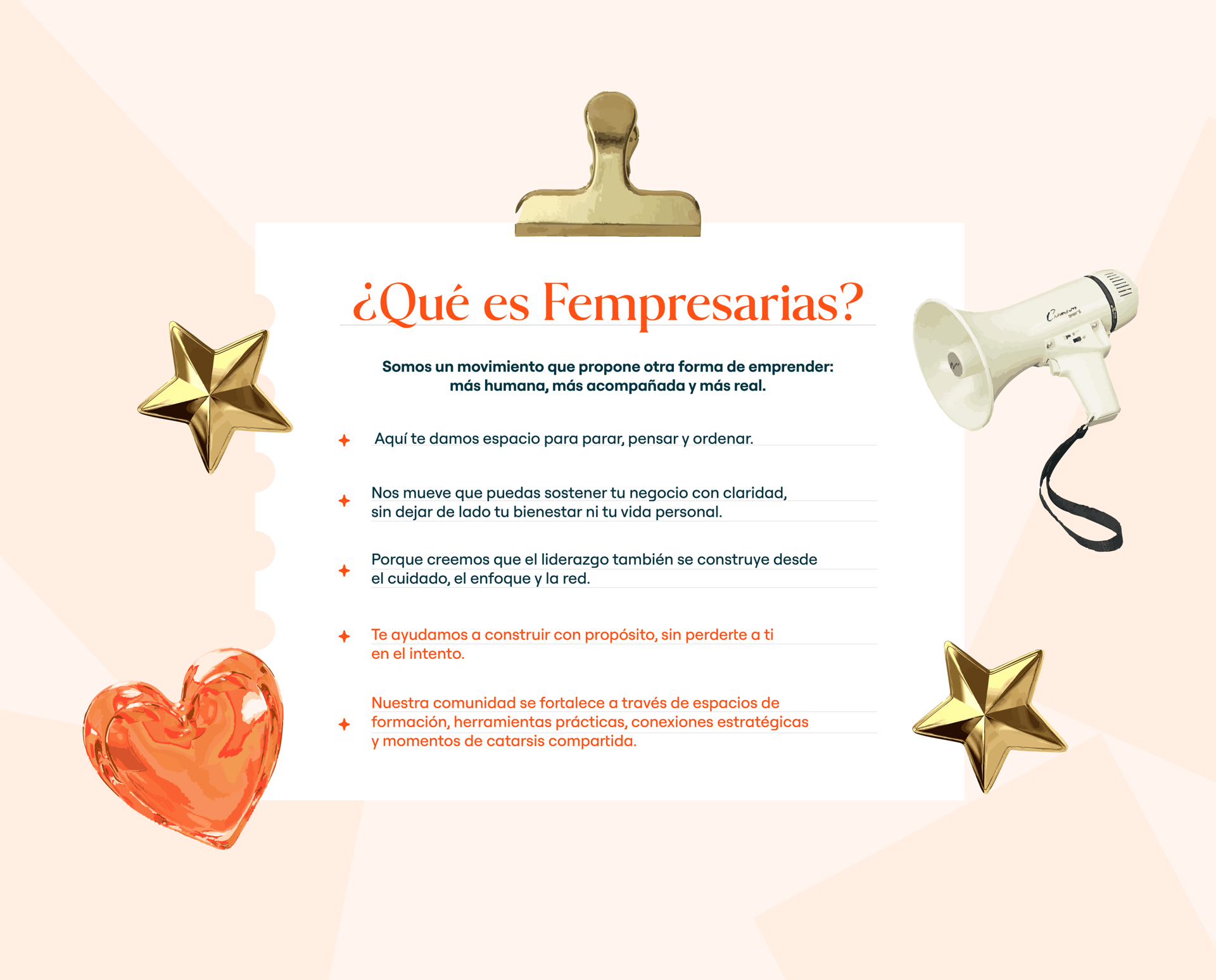 Fempresarias, nace de su convicción de que ninguna mujer debería emprender sola. Aquí, cada conexión, aprendizaje y desafío compartido nos hace más fuertes.